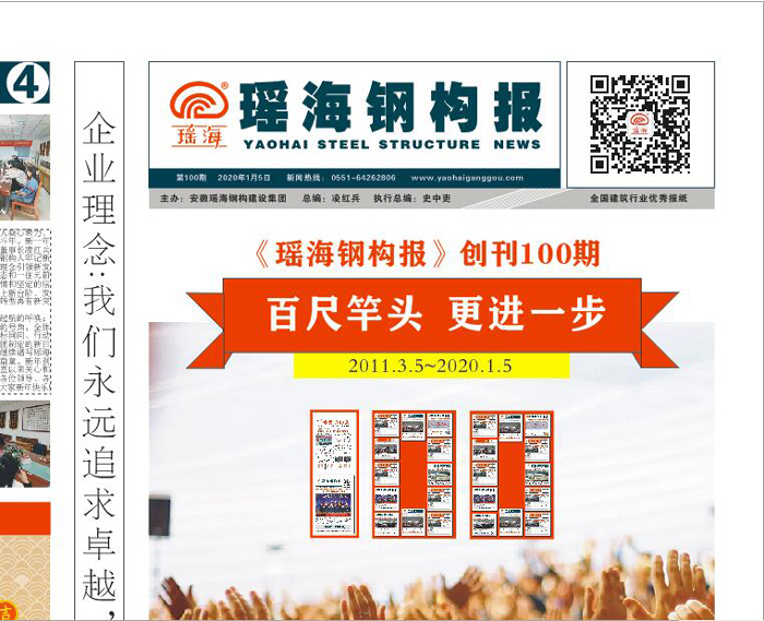 《瑶海钢构报》月刊成立于2011年初,2011年3月正式面世出刊发行第1期。时光如梭,岁月轮换,今年1月份出刊第100期。