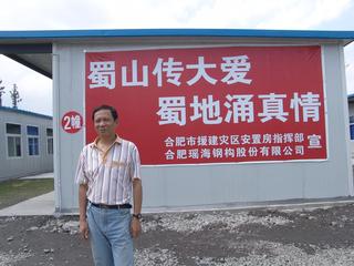 吴银同——公司货车司机,吴银同是我公司最早援建四川灾区最早出发的员工,5月23日下午,他载着瑶海钢构第一批援建材料在省建设厅组织的出发仪式上,带 着公司全体员工的深情厚谊奔赴四川灾区。在整个援建过程中,前期他一直负责公司材料运输,从合肥到都江堰建设工地,单程就需要两天两夜,为了在最短时间内 将材料运送到施工现场,保证现场正常安装,吴银同在路上从不休息,两个人轮流开车,饿了就啃点方便面或随便买点吃,确保建设材料在第一时间运送到现场。后 期材料运输完毕后,他又留在施工现场负责各个工地之间倒货,在工地上,由于缺少装卸工,吴银同经常是即充当司机,又充当装卸工。一车五六套安置房的材料, 经常是他一个人负责装卸,对于这些工作,他从来没有抱怨过,总是默默地奉献着。