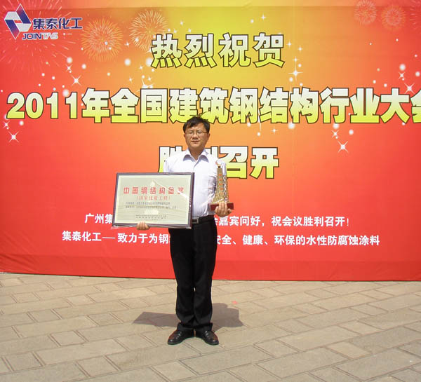 2011年4月12日,公司董事长凌红兵及总经理助理杨雄代表公司前往昆明参加由中国建筑金属结构协会举办的2011年全国建筑钢结构行业大会暨颁奖盛会,由我公司承建的合肥火车站无站台柱雨棚(1项) 钢结构工程(构件制造)获得“中国钢结构金奖”荣誉,来自全国各地的钢结构获奖单位参加了此次的颁奖典礼。会议首先总结了钢结构行业的发展状况,并对取得 较好成绩的单位给予了表扬,随后对获奖单位进行了颁奖。合肥火车站工程是合肥连接东部与中西部的重要铁路枢纽地位的标志性 工程,于2009年5月1日正式启动,规划站房和售票厅扩容一倍,新建无站台结构雨棚,站房进站天桥及出战拓宽一倍,总投资约5亿元,改建完毕后合肥火车站将成为一个现代化,规模化,科技化,环保节能型的国家一等客运站,新建站房建筑面积13058平方米,无柱站台雨棚60000平方米。