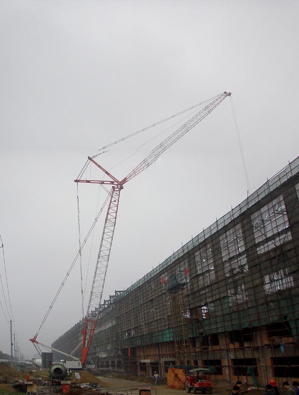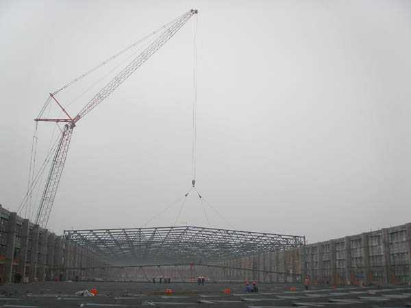 本报讯:由我司承接、生产部副总经理汪文友负责的彩虹(合肥)光伏三厂二标段工程经过紧张的生产和准备,与2011年11月3日9时18分成功实现吊装。该工程两边立柱高达24米,东西跨度高达60米,且中间无柱体支撑,钢结构全部采用管桁架制作,工艺复杂,运输难度大,本次吊装采用260吨履带吊,这在我公司承接的工程中是绝无仅有的。这一工程的成功吊装标志着我公司在工程技术方面又迈向了一个新的台阶。另获悉,彩虹(合肥)光伏项目,总投资18.5亿,建设两座日熔化能力500吨的玻璃熔窖,配套12条125T/D压延玻璃生产线和相应产能的玻璃镀膜、钢化生产线。项目建设期一年,建成后可年产3.2毫米厚度的光伏玻璃原片3034万平方米,加工形成钢化和镀膜光伏玻璃2821.7万平方米,年产值超过14亿元。