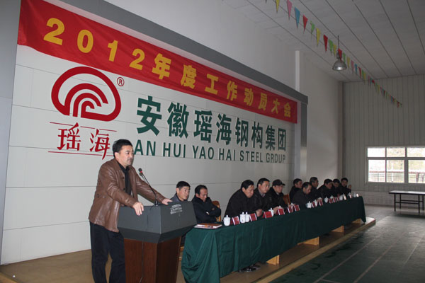 2012年2月9日,瑶海钢构一年一度工作动员大会在公司多功能厅隆重召开,董事长凌红兵、分管领导及公司全体员工参加了会议,会议由总经理助理杨雄主持。会议分二部分进行,一是由公司董事长凌红兵作动员报告,二是分管系统代表做表态发言。首先凌总对春节期间奉献在一线岗位的员工表示感谢,随后对2011年工作进行了回顾和总结,对2012年的工作进行了安排和部署。凌总强调,“2012年,是我公司十二 •五规划的第二年,也是我公司快速发展的一年,目标紧,任务重,如何完成目标任务,是我们在座的各位必须思考的问题,靠现有的轻钢产业很难完成,怎么办?所以第一,我们必须启动400亩重钢基地和300亩玻璃幕墙产业,加快步伐,加快脚步,方能赶上同行的步伐、时代的脚步。二是从小事做起,有责任心,能吃苦且专业要扎实,以此列举了2011年工作典型,如工程部副经理魏达猷、二厂厂长李强等,正是因为他们的努力,能吃苦才使得他们所负责的工程和生产得以顺利发展。”三是开展科学考评,合理的管理体系,通过考评拉开差距,形成你追我赶的良好局面。四是全面发展,早日实现十二•五规划目标。接着销售公司总经理周志伟对2012的工作做了表态,在肯定过去一年成绩的同时表示过去已经归零,面对新的一年任务,虽然有压力,但压力和动力并存,同时对目标任务进行了细化,并强调企业要生存一定要有差异化。工程系统负责人司贵武也从安全质量的角度对2012年度工作进行表态发言。最后,总经理助理杨雄做最后的动员,一是要准确领会董事长讲话精神,二是要确定集体贯彻落实的措施,三是及早行动,全力抓好第一季度各项工作。