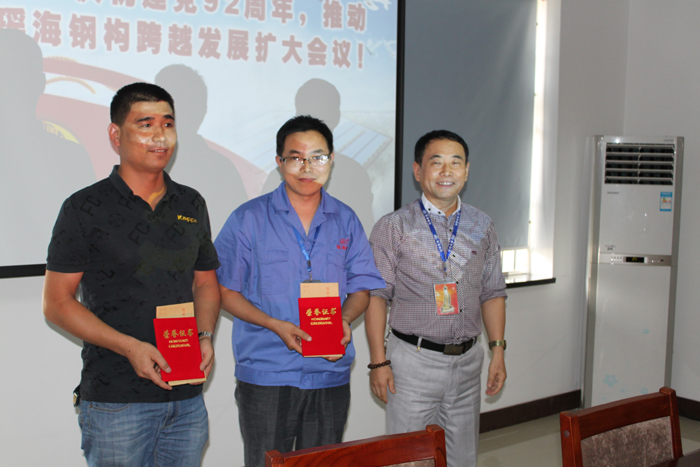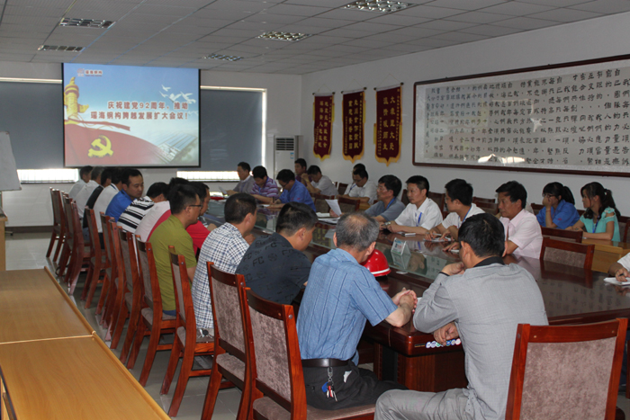 本报讯:6月28日下午,安williamhill结构股份有限公司党总支召开庆祝中国共产党成立92周年,推动瑶海钢构跨越发展扩大会议。集团公司中层以上管理干部、部室班组党员、预备党员及入党积极分子40余人参加了本次大会。会议首先集团公司党总支委员劳建新同志宣读了表彰优秀党员的决定,王一麟同志荣获“新站区优秀共产党员” 称号,李强、史中吏被授予“瑶海钢构公司优秀共产党员”称号,并宣布成立瑶海钢构党员志愿服务队。其后,廖书记带领在座的共产党员、预备党员和入党积极分子、中层以上管理干部学习了“习近平同志在党的群众路线教育实践活动工作会议上所提出的‘照镜子、正衣冠、洗洗澡、治治病’总要求”及相关精神,要求领导干部破除习惯性高人一等、自我感觉优越、独立王国等等思维定势,明确个人的角色定位,更加清醒地审视自己的一言一行。随之,参会人员踊跃发言,结合自身的工作岗位,探讨“照镜子、正衣冠、洗洗澡、治治病”的心得体会,并一致表示在今后的工作中,对照公司制度和标准,查不足,找差距,以制度为绳,看一看自己的言行举止是否符合公司规范要求,以标准为矩,看一看自己的工作业务是否符合公司绩效考核指标。要“在其位谋其职”,务实工作,不断提升和改变自我。最后廖书记总结讲话,并提出了三方面要求:一是全体党员要时刻以党员的身份要求自己,加强团结性和纪律性,凝心聚力、开拓创新;二是继续深入学习党的十八大精神,贯彻落实中央“八项规定”精神,严格自律,维护好党的形象;三是继续深化基层党组织建设工作,紧密围绕企业中心工作,立足本职、发挥作用,促进分集团科学健康持续发展。
