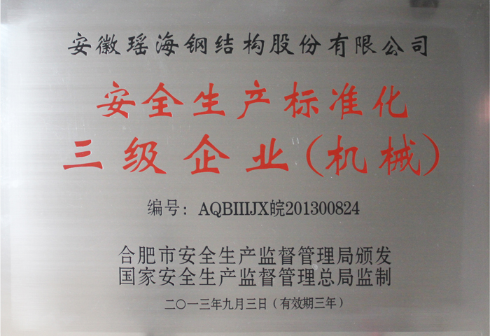 瑶海钢构自成立以来,公司领导一直大力开展安全标准化工作,十分重视建立健全安全生产长效机制,组织员工定期排查安全隐患。瑶海钢构在推进安全生产标准化工作中,认真落实国家、行业安全生产管理法规标准要求,完善相关管理制度,积极开展各项工作,强化全员安全生产教育培训,加大安全投入和检查整改力度,努力改善生产作业环境,安全标准化体系建设符合规范要求,合肥市安全生产监督管理局一致同意瑶海钢构通过安全标准化三级考评验收,并颁发了安全标准化三级企业证书。