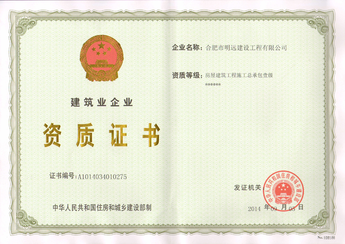 本报讯:来自资质办的好消息,经住房与城乡建设部审核批准,安williamhill构集团所属合肥市明远建设工程有限公司荣获房屋建筑工程施工总承包壹级资质。房屋建筑工程施工总承包壹级资质的取得标志着明远建设公司在建设范围和公司管理上又迈上了一个新的台阶,对整个集团公司的发展具有里程碑式的重大意义。