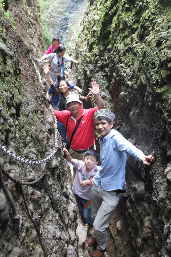 身体艰难攀爬之际,心头欣赏着裂谷间叠翠流芳之美,享受着浑如天簌的自然幽静之趣。爬完这三道闸不觉感慨在此游亦犹如走人生之路,惟选择继续前行和不懈努力才有登峰后的成就和喜悦。最后闯过“三道闸”终于到达了好汉亭,心中有一股征服大自然的豪情油然而生。