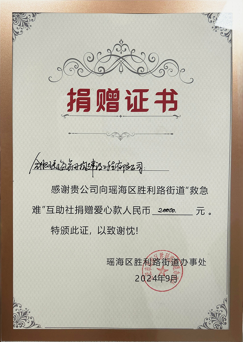 本报讯:2024年9月8日,我司向瑶海区胜利路街道进行了爱心捐款,捐款金额为20000元。 此次捐款活动是我司积极履行社会责任,回馈社会的一种方式。多年来,企业在发展的同时不断履行社会责任,并多次向社区捐款捐物,在2008年汶川大地震发生后,瑶海钢构第一时间请缨前往灾区现场,历时两个月,为灾区人民援建1500套过渡安置房和四所学校;