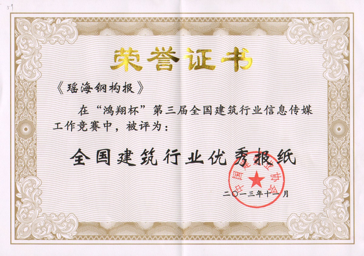 本报讯:为期三个月的“鸿翔杯”第三届全国建筑行业信息传媒竞赛评比工作落下帷幕,经过专家组评议,中国建筑业协会审定,最终《瑶海钢构报》和瑶海钢构网站脱颖而出,分别获得报纸类优秀报纸和网站类优秀网站。