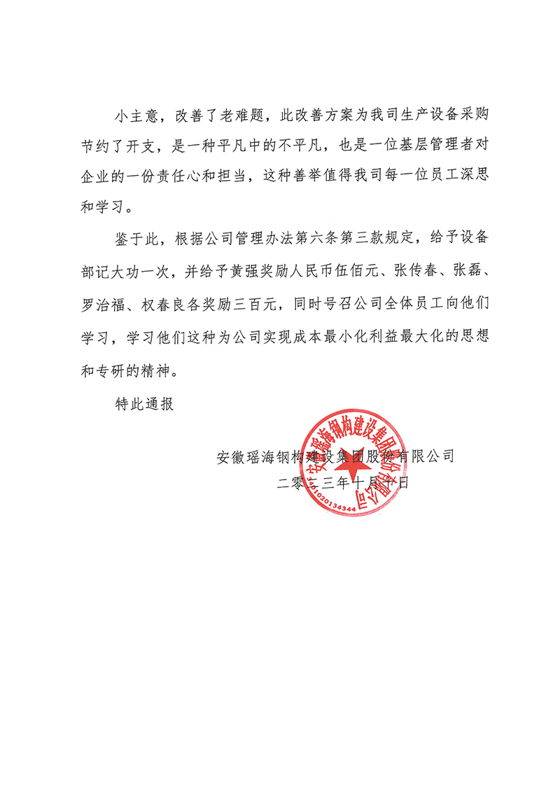 鉴于此,根据公司管理办法第六条第三款规定,给予设备部记大功一次,并给予黄强奖励人民币伍佰元、张传春、张磊、罗治福、权春良各奖励三百元,同时号召公司全体员工向他们学习,学习他们这种为公司实现成本最小化利益最大化的思想和专研的精神。